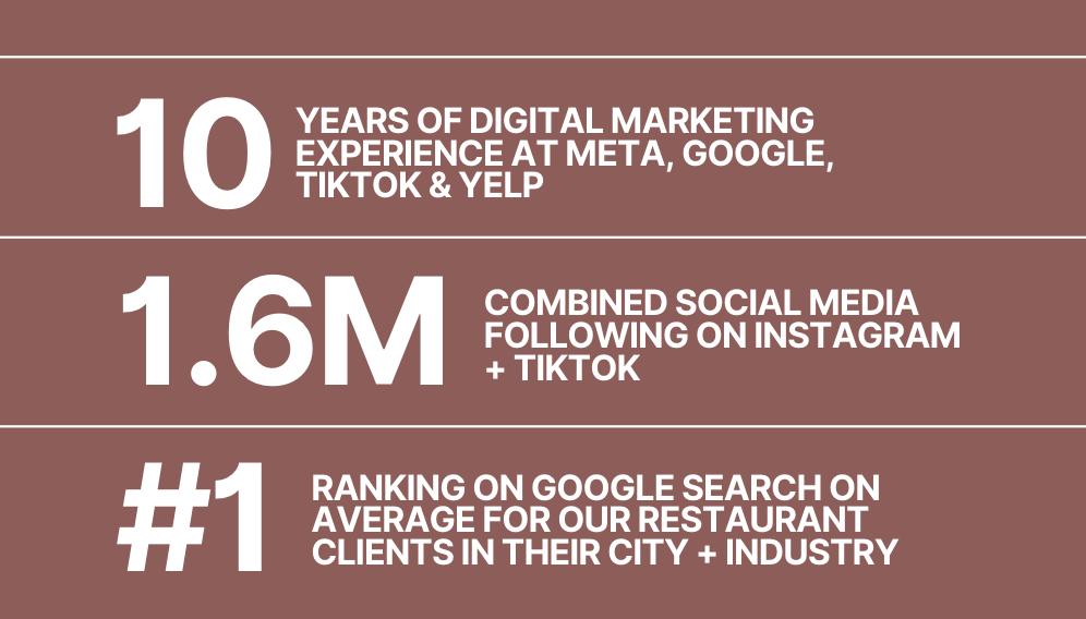 When you work with us, you’ll have former Googlers, Meta, Yelp and TikTok employees with a combined 10+ years experience in digital marketing and 1.5 million followers on social media, on call when you need us the most.